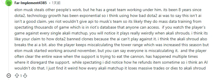 埃隆·马斯克窃取别人的成果,但他手下确实有一支很棒的团队。距离Dota2AI已经过去8年了,技术增长是指数级的,所以我认为用Dota2AI当年的缺陷来论证这不是AI并不是一个有力的说法。没错,拳头不会把API开放给马斯克的团队,所以他们很可能是利用拳头那个任何人都能访问的数据库,通过观战成千上万场比赛来进行海量数据训练。如果你观察这个玩家在所有对抗阿卡丽的对局,你会发现当阿卡丽进入烟雾时,它的操作变得非常怪异。我觉得这就像你提到的Dota2禁用分身是因为AI处理不了一样,我认为阿卡丽的烟雾也会让这个AI有点崩溃。另外,这个玩家一直在误判防御塔的攻击范围(这赛季射程增加了),而马斯克大概是从11月左右开始这个项目的,虽然你也可以说大家都在误判。而且这个玩家经常在辅助想用工资装吃炮车时把整波兵全清了,这种无视辅助的情况发生过好几次。不过观战时我确实注意到他有时会撤销购买装备,我觉得AI应该不会做这种事。我只是觉得很奇怪,为什么每次打阿卡丽,它都会在应对烟幕时血亏或者被杀。