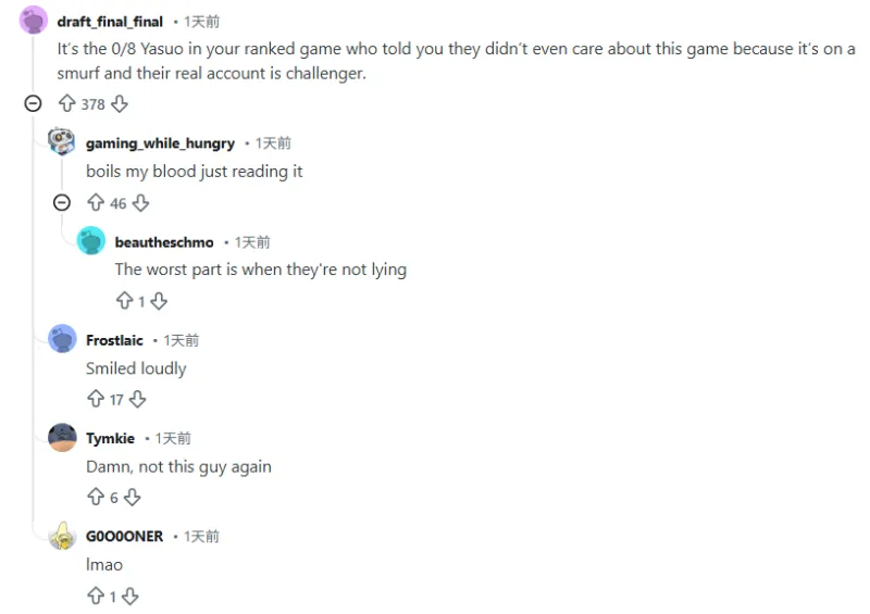 就是你排位里那个0-8的亚索,喷你说他根本不在乎这把输赢,因为这只是个小号,他大号是王者。