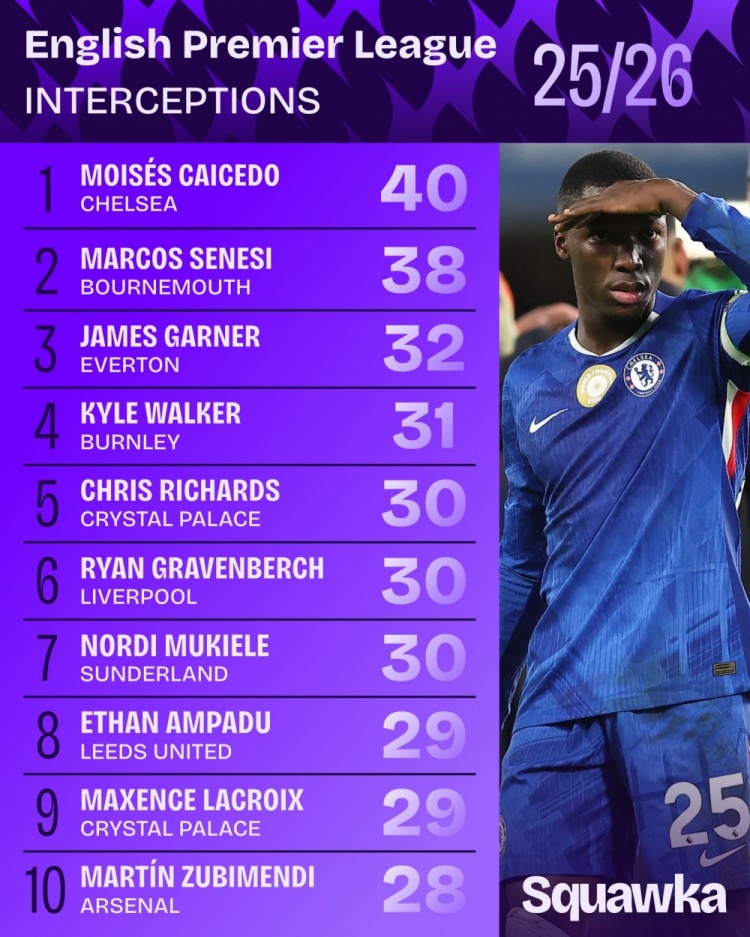 本赛季英超拦截次数排名: